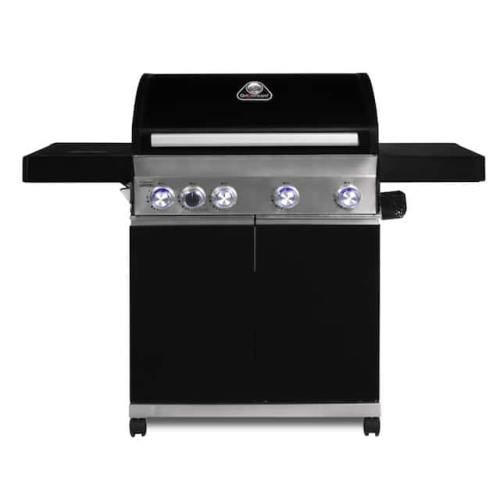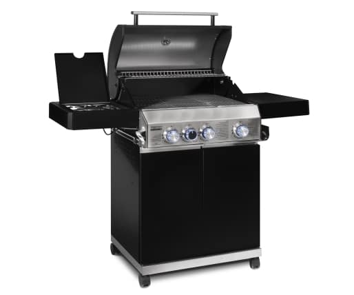 הגריל מאובזר בכירת צד לטיגון ובישול, 4 גלגלים עם מעצורים, מכסה עם בידוד כפול, תאורת לד לכפתורים, רשת עליונה לחימום והפשרה, ארון אחסון ופותחן בקבוקים.