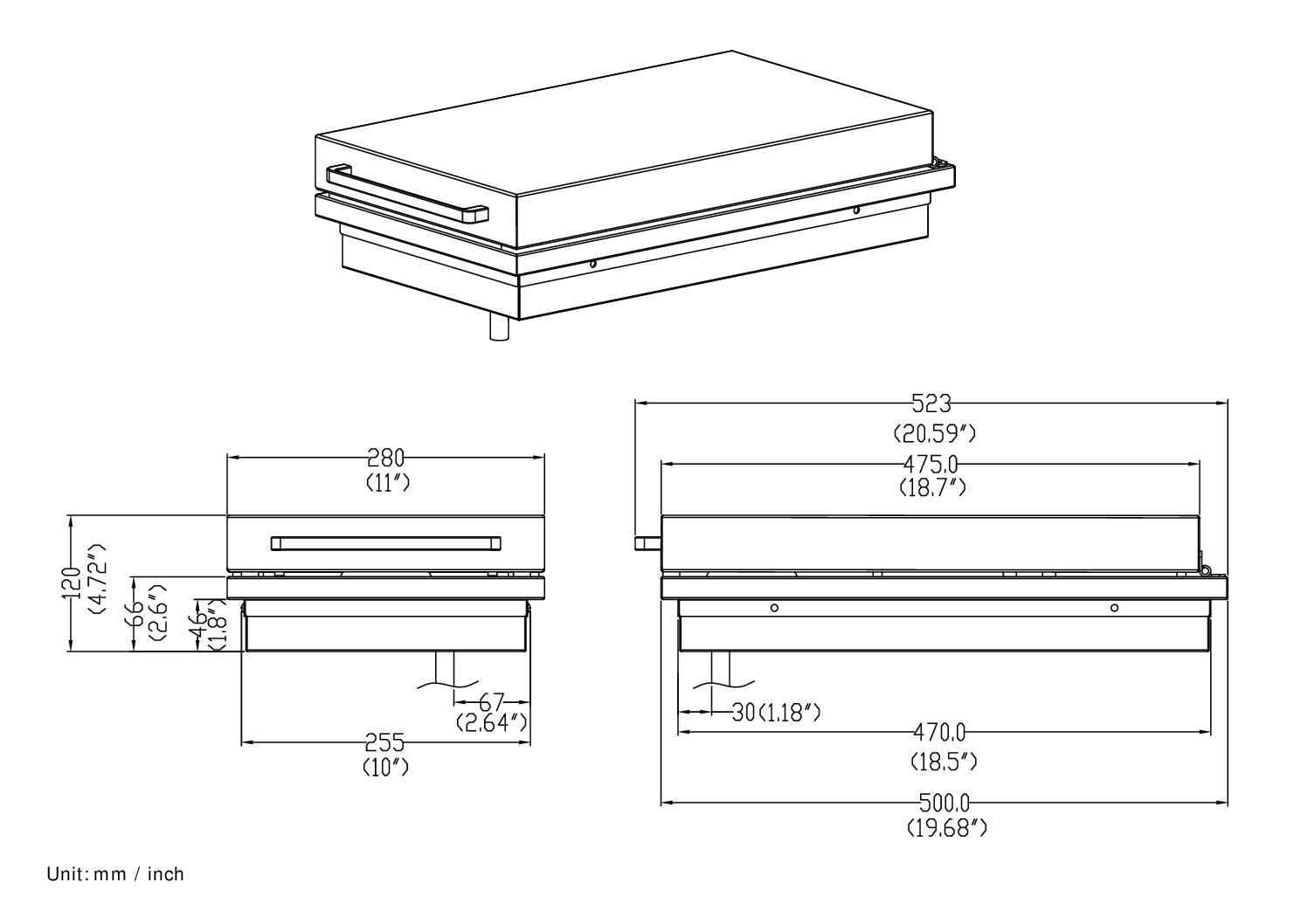 מידות חיצוניות: רוחב 28 ס”מ, עומק 52.3 ס”מ, גובה 14.3 ס”מ.