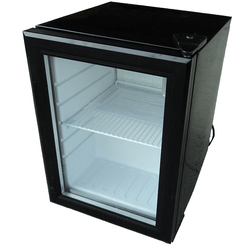 מקרר תצוגה הפועל באמצעות מדחס עם דלת זכוכית המיועד לאחסון משקאות או כל מוצר אחר. יכול גם להתאים כמקרר למשרד.