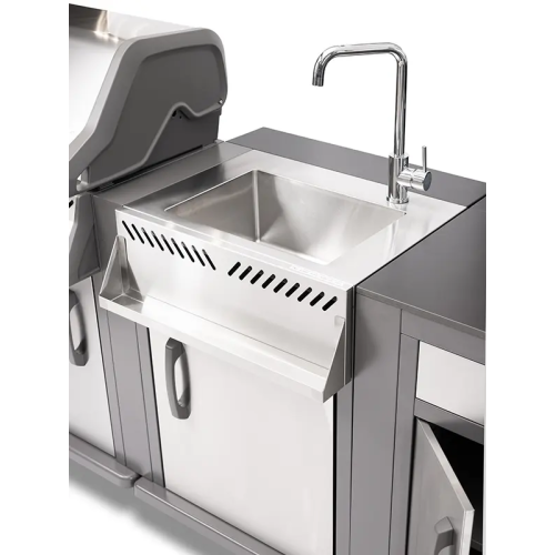 יחידת כיור אלגנטית הכוללת ברז איכותי, ניקוז וארון אחסון – פתרון מושלם לשטיפת ירקות, כלים והכנת מזון כחלק ממטבח החוץ המלא שלך.