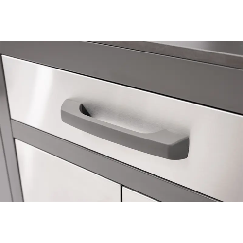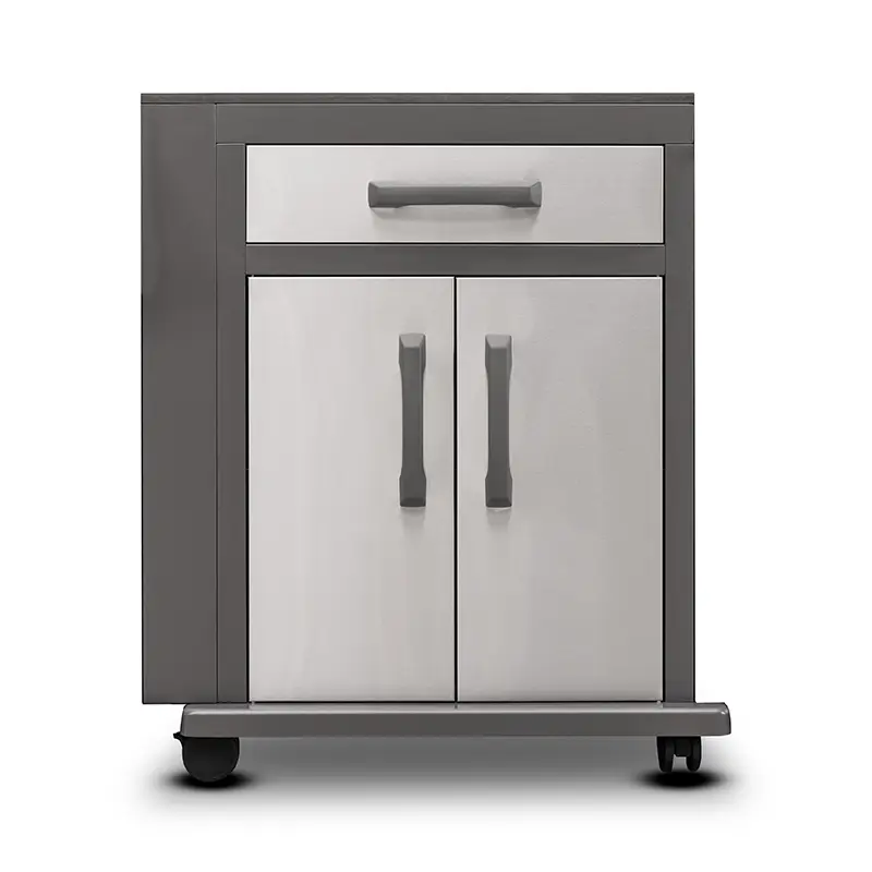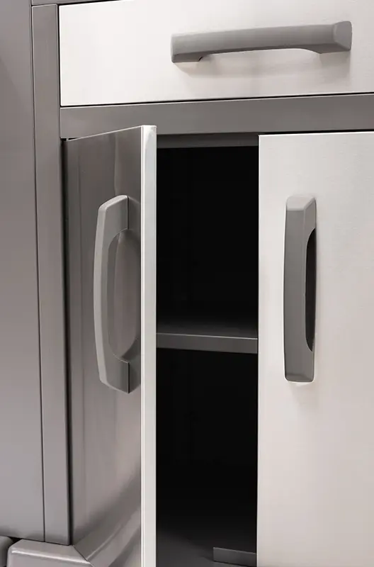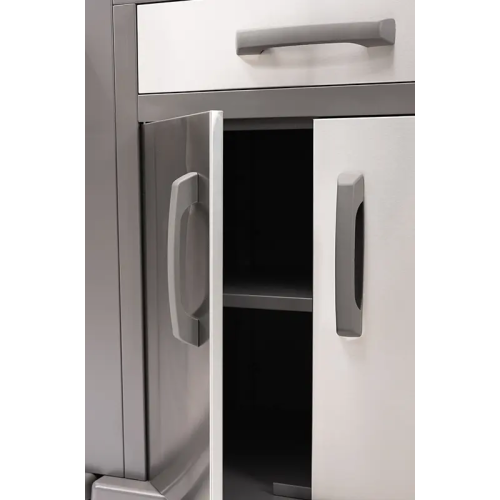 עמדת האחסון כוללת מגירה עליונה עם סכומון, ארון שתי דלתות עם מדף פנימי ומשטח עליון מפורצלן לעבודה.