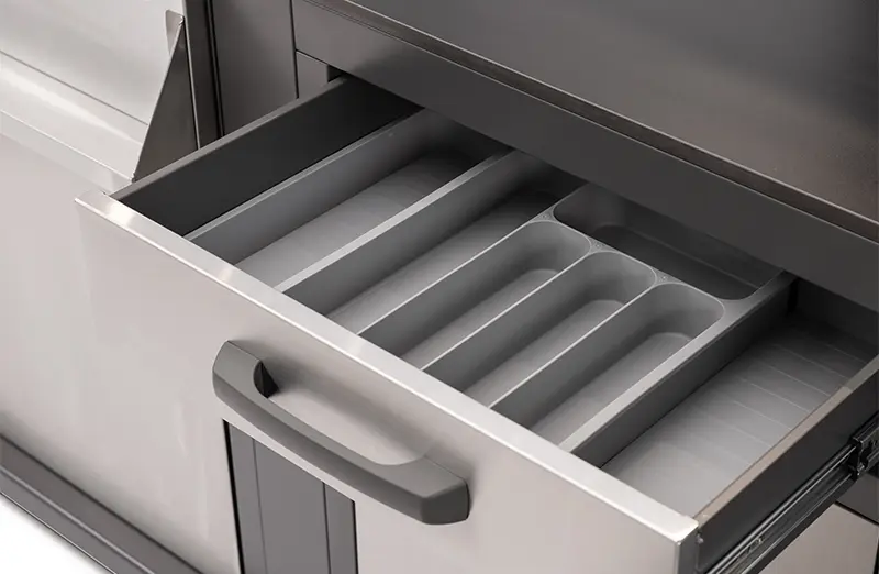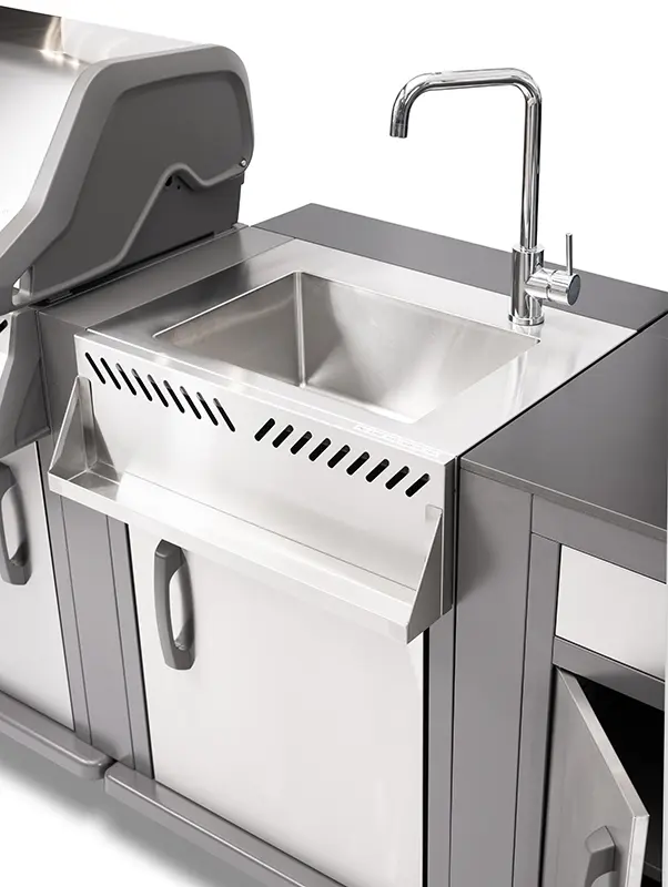 עמדת הכיור כוללת ברז נירוסטה מעוצב עם שנתיים אחריות, מדף תבלינים, ארון אחסון, מדף הגריל ניתן לחיבור בסוף היחידה.