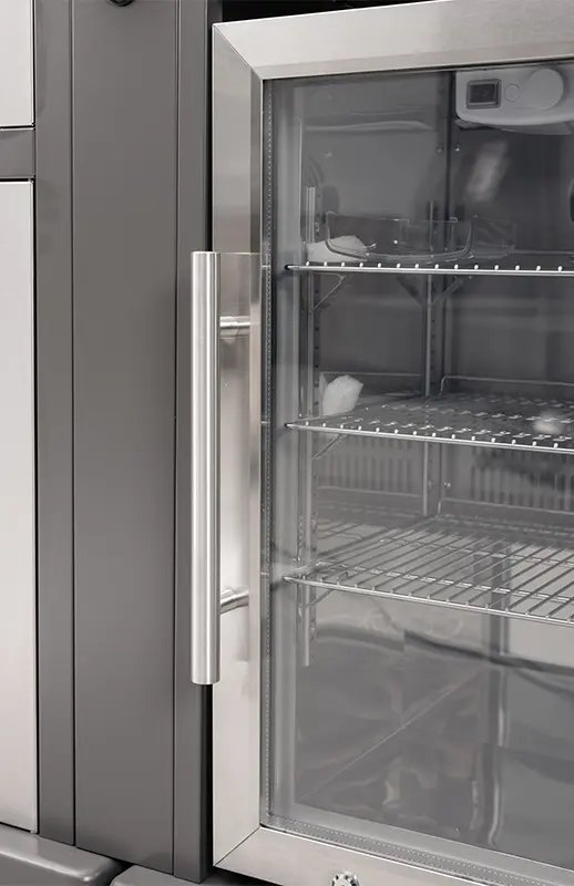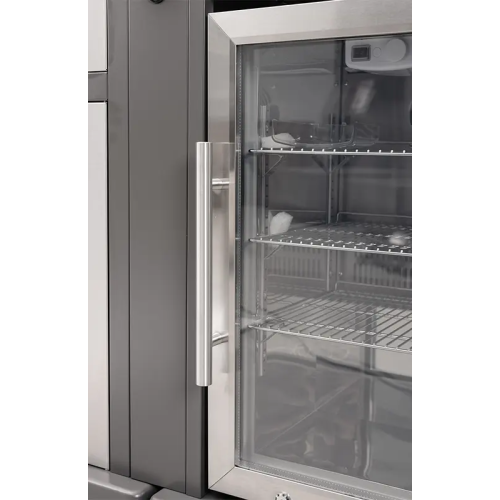עמדת מקרר 60 ל׳ חזית שקופה עם משטח עליון מפורצלן לעבודה.