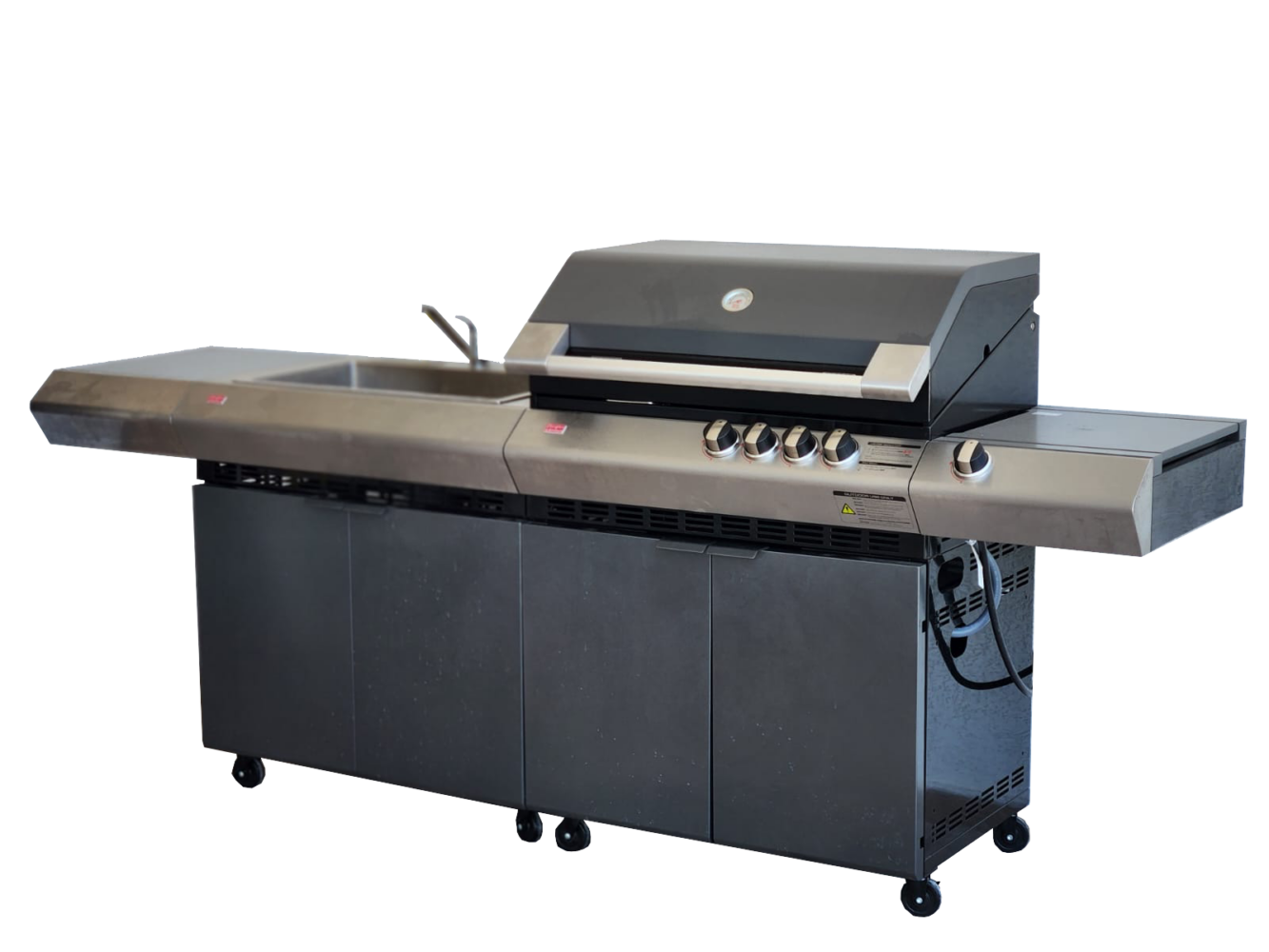 המטבח כולל כיור ענק ברוחב של 63 ס"מ על 35.5 ס"מ אורך, כיור מאוד שימושי לשטיפת כלים כדי שנוכל לשטוף בקלות את כל הכלים שלנו במטבח החוץ. הכיור כולל סבוניה ומתקן ליבוש סכינים (עד אורך להב של 35 ס"מ) פקק איטום נירוסטה ו 2 סוגים של מסנני פסולת בניקוז.
